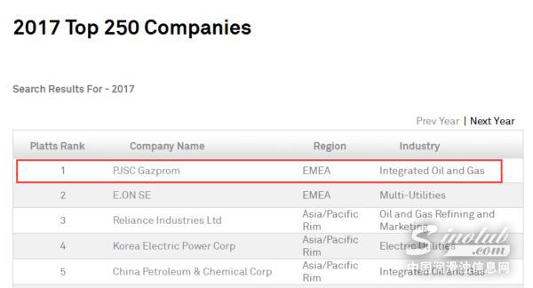 在2017由国际著名市场情报机构——普氏能源发布的2017年度“普氏全球能源公司250强”榜单中,俄罗斯天然气工业公司力压一众国际能源巨头,毫无悬念地夺得了第一宝座,领先于埃克森美孚、道达尔及中国石油化工股份有限公司。(该排名基于企业的资产、营收、利润和投资回报率。)