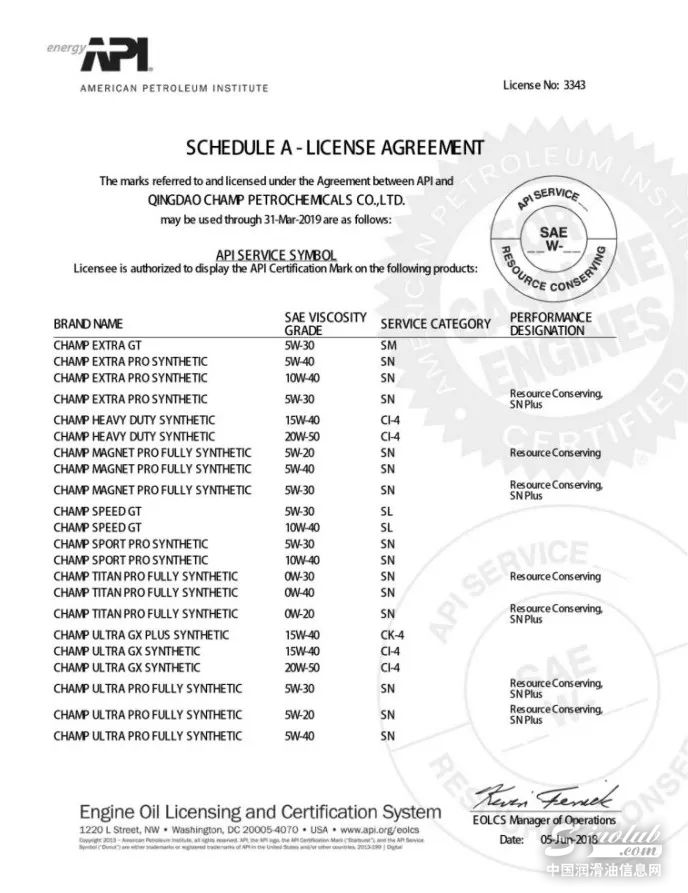 冠军®润滑油多款产品也在第一时间申请了美国石油学会API SN Plus认证,并于近日顺利通过认证。