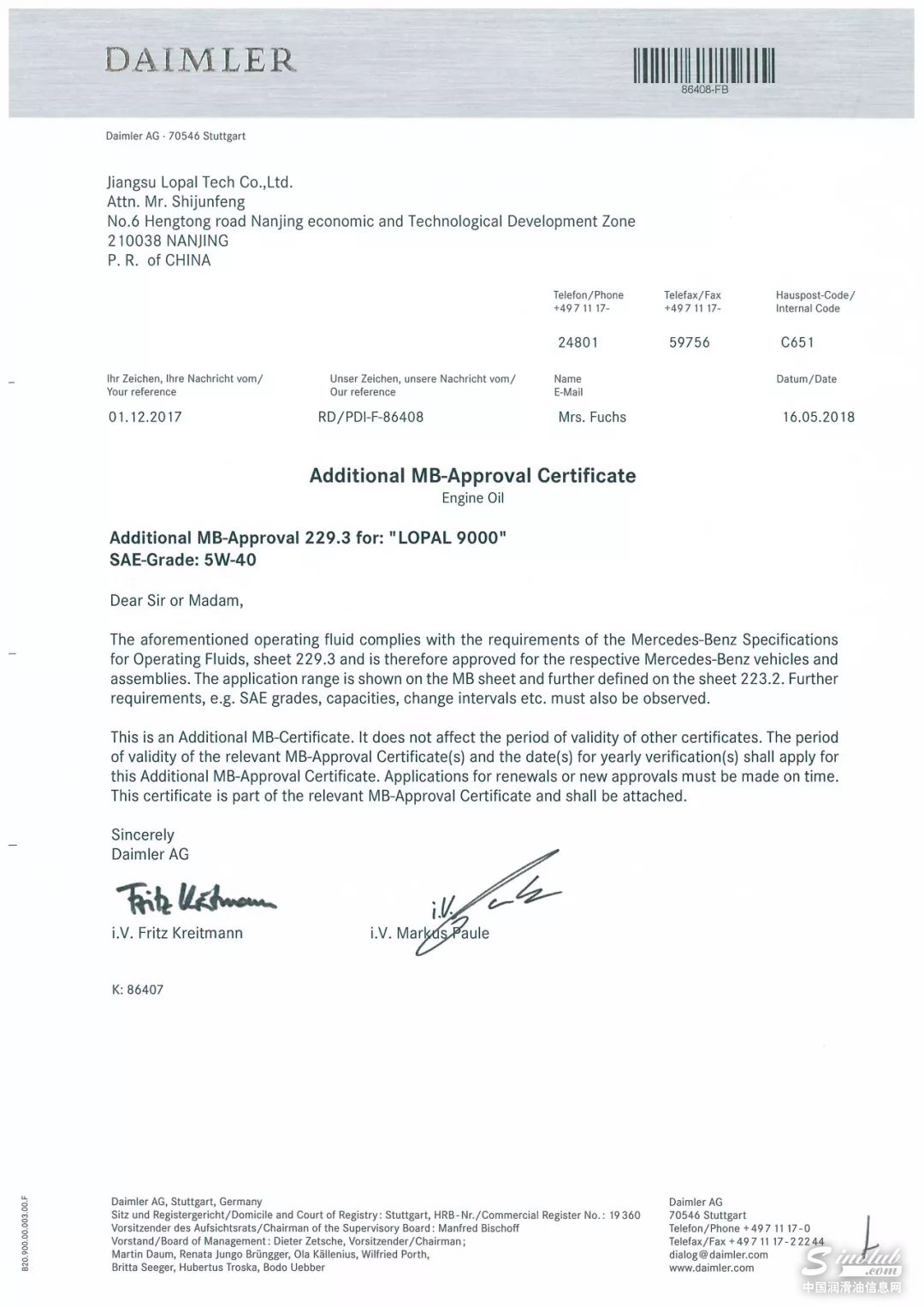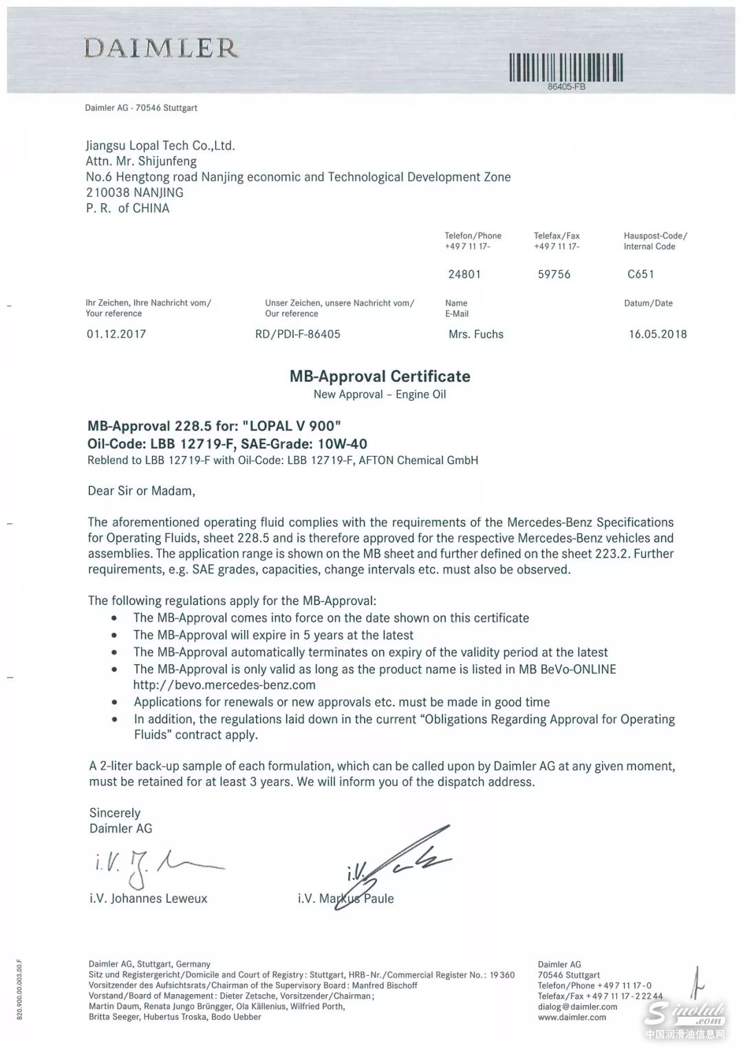 近日,龙蟠润滑油四款产品分别得到国际一线发动机厂商——梅赛德斯奔驰的MB229.5/ MB229.3 / MB228.5 / MB228.3技术认证。