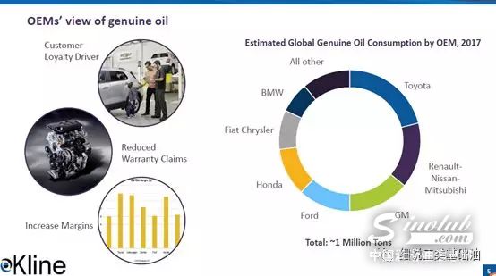 首先是Kline的报告,主要介绍了全球OEM初装油的情况。根据该公司分析预测:2017年全球OEM工厂初装油总量大约为100万吨。主要的厂家为:丰田、雷诺日产三菱、通用、福特、本田、菲亚特克莱斯勒和宝马等。前三家的总量约占50%。