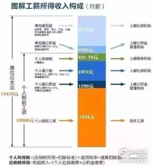 雇主每月付出了14410元,职工个人拿到了7454.30元。之间6955.70元的差额,究竟去了哪里?下面再以图表作出说明。
