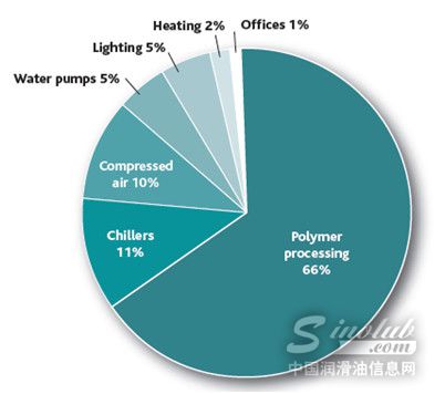 该指南指出,当塑机生产塑料制品时,绝大部分的能源被用于聚合物加工(66%),其他能源则被消耗在了冷却装置(11%)、空气压缩(10%)、水泵(5%)、照明(5%)、加热(2%)及其他用途(1%)之上。