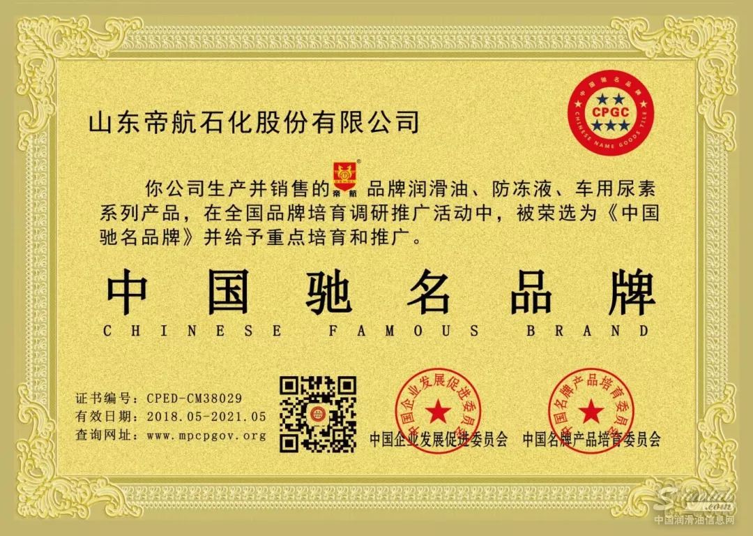近日,山东帝航石化股份有限公司经国家相关认定部门审核,再次获得国家认可,被评为“中国驰名品牌”和“中国著名商标”。