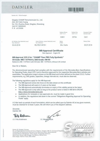 近日,曾斩获“LubTop2017技术创新金奖”的冠军钛能0W-40 酯类全合成发动机油,凭借其卓越的品质,顺利通过德国梅赛德斯-奔驰MB 229.5原厂认证。