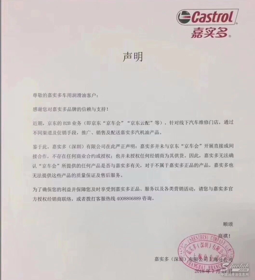 中国润滑油信息网(www.sinolub.com )从市场获悉,嘉实多(深圳)有限公司日前发表声明,表示嘉实多并未与京东“京车会”开展直接或间接合作。