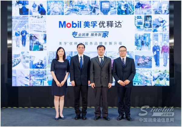 埃克森美孚北亚区市场发展部总经理陈怡青女士、工业润滑油总经理杨东先生、北亚区润滑油业务总工程师陈思轩先生、北亚区商业市场部总经理王章军先生在美孚®优释达®服务全新升级发布仪式上合影