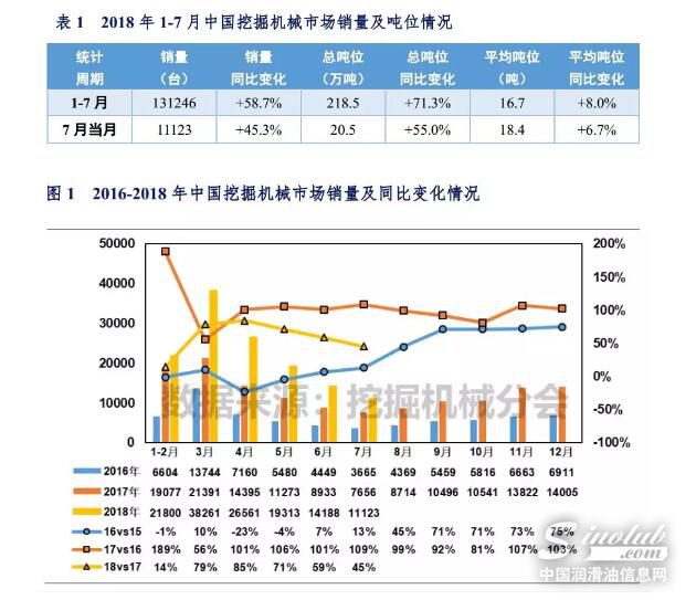 根据中国工程机械工业协会挖掘机械分会统计数据,2018年1-7月纳入分会统计的25家主机制造企业销售情况如下表所示。1-7月销量131246台,同比涨幅超过50%,市场持续高增长。平均吨位大幅提高,说明中、大挖市场占比提升。2018年1-7月销量接近2011年历史极值(133383),创造历史同期第二高销量。