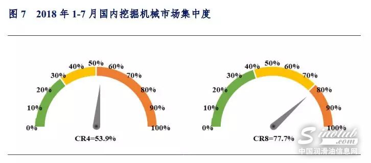 2018年1-7月国内挖掘机械市场集中度CR4=53.9,CR8=77.7,与6月市场集中度持平。其中,大挖、中挖、小挖CR4市场集中度分别为56.8%、52.2%和54.6%,CR8市场集中度分别为81.7%、78.0%和78.1%。