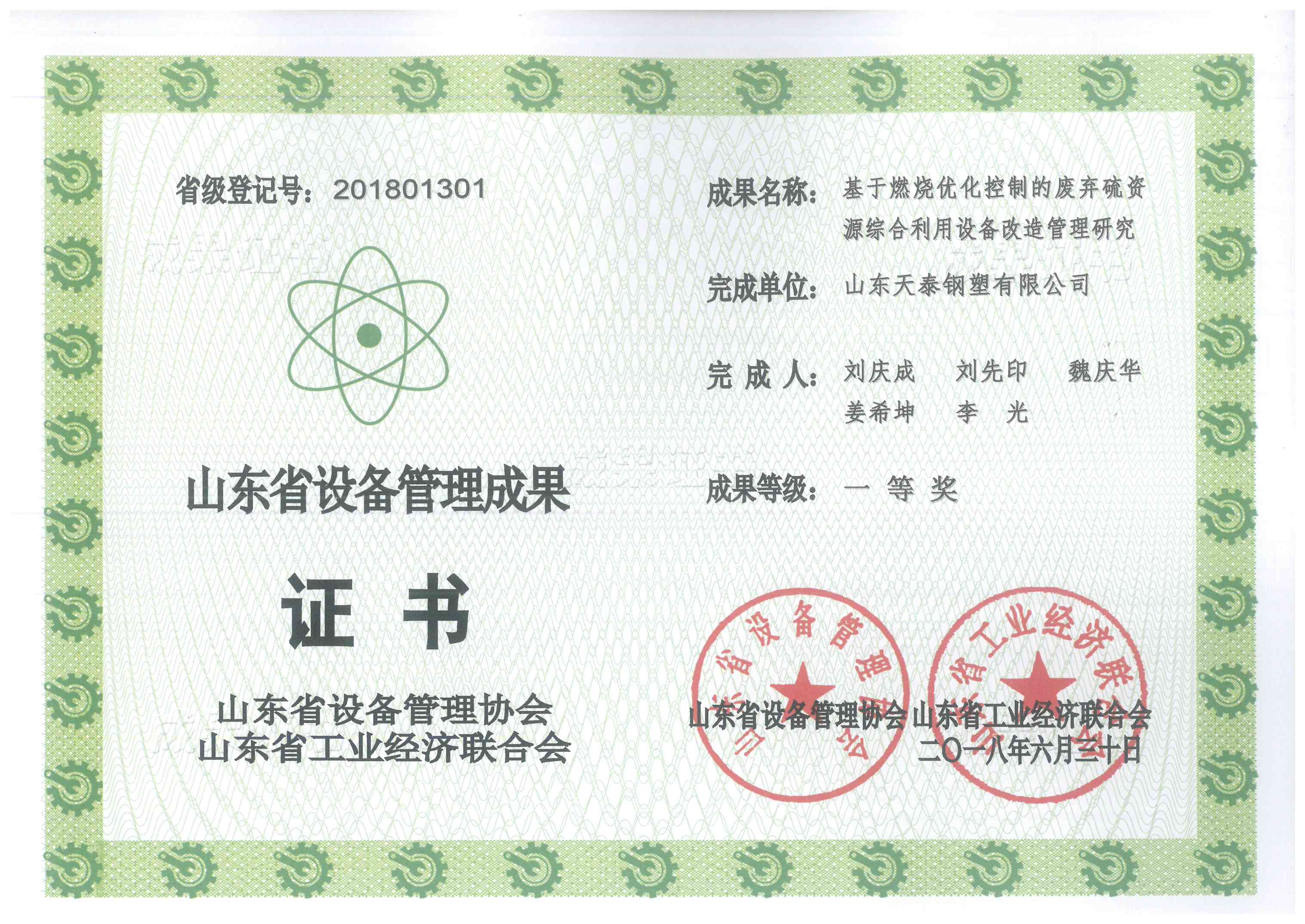 2018年6月30日,山东天泰钢塑有限公司申报的 “基于燃烧优化控制的废弃硫资源综合利用设备改造管理研究”经山东省设备管理协会、山东省工业经济联合会专家组委综合评定,荣获山东省设备管理成果一等奖。