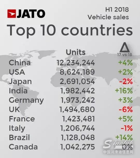 今年上半年全球汽车销量前三名的市场依次是中国(12,234,244辆,同比增长3.9%)、美国(8,624,189辆,同比增长2%)和日本(2,691,054辆,同比下降2%)。印度凭借上半年1,982,442辆的汽车销量超越德国,位居第四。据LMC Automotive预测,印度将在2021年超越日本,成为全球第三大汽车销售国。如果将欧洲29国算为单一市场的话,那欧洲整体市场以977万辆的成绩排名第二。