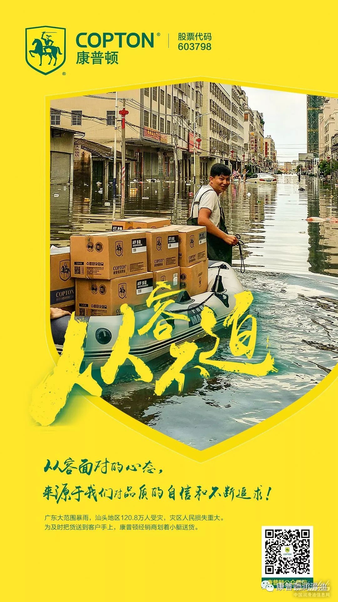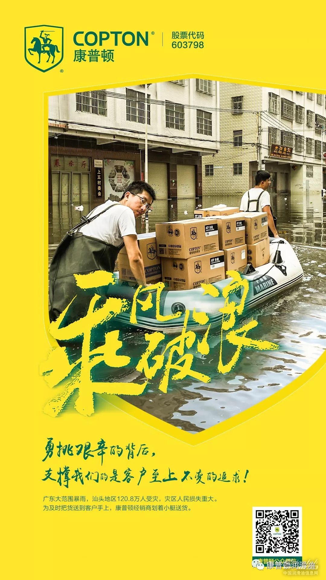 广东大范围暴雨,汕头地区一百多万人受灾。为了更加及时的将货送到客户手上,经销商用皮划艇送货。感谢奋斗在一线的康普顿人。