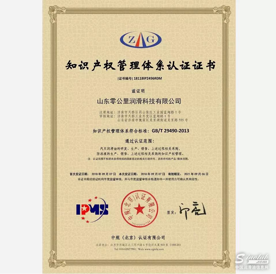 零公里润滑油通过知识产权管理体系认证!