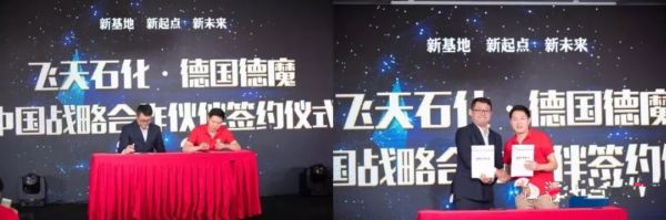 会议隆重举行飞天石化与德国德魔战略合作签约仪式,飞天石化副总吴建华与德国德魔中国区负责人何思汉双方在合约上签字,飞天石化成为德魔润滑油中国总代理,标志着飞天石化正式进军高端汽机油市场,开始向行业“塔尖“发力。