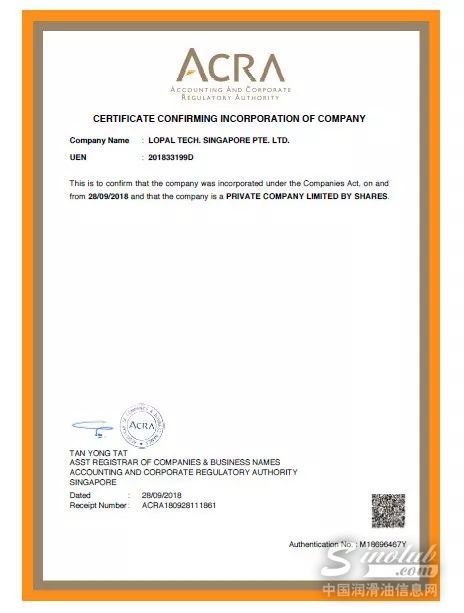 9月28日,龙蟠科技正式获得ACRA(新加坡会计与企业管理局)颁发的企业注册证书。这标志着,继南京微蚁数据科技有限公司之后,龙蟠科技的第七家子公司——龙蟠科技(新加坡)有限公司在今天正式成立了!这是龙蟠科技实现全球化战略发展的又一重要里程碑。