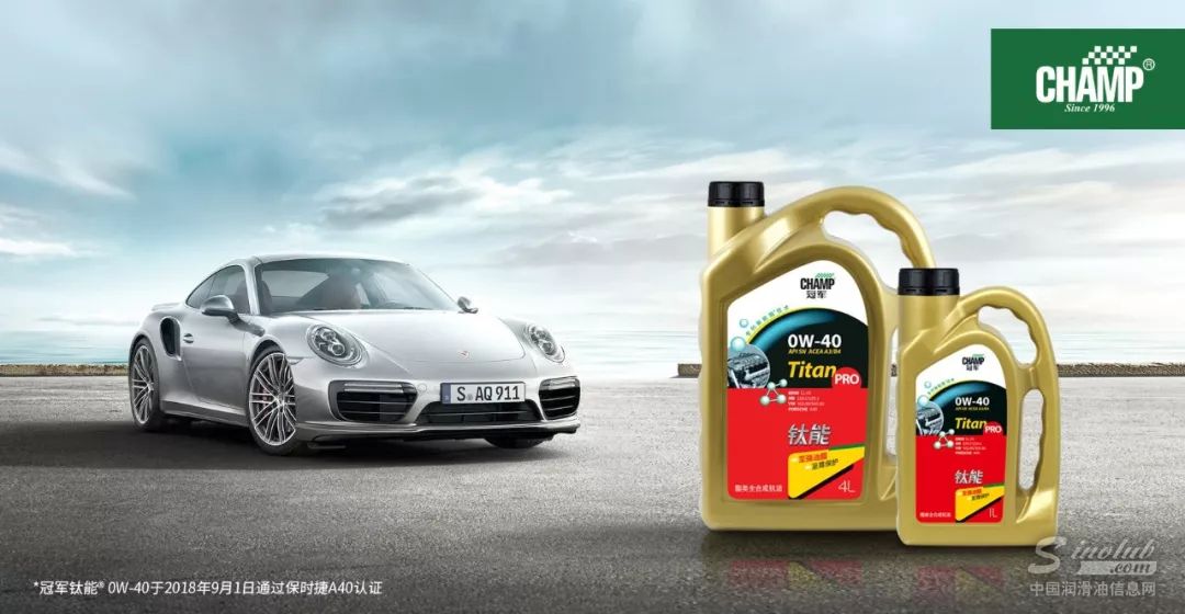 近日,曾斩获“LubTop2017年度技术创新金奖”的冠军钛能®0W-40 酯类全合成发动机油,再一次获得德国保时捷汽车认可,通过保时捷A40原厂认证,自2018年9月1日起被正式列入保时捷汽车官方润滑油推荐表中。