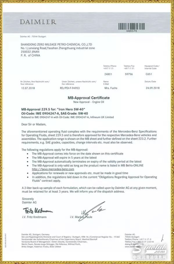 零公里润滑油汽机油系列产品获得奔驰MB229.5标准技术认证!