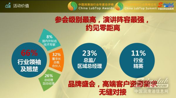 由中国润滑油信息网(www.sinolub.com)、《润滑油市场》杂志发起主办的LubTop2018中国润滑油行业高峰论坛将于2018年11月26日在上海隆重举行,本届论坛的主题是“绿擎未来 智赢终端”。LubTop2018论坛旨在倡导润滑油和汽车后市场品牌关注低碳、节能、环保和循环发展生产体系的建立与完善,加快构建生态文明体系,以绿色发展托举起产业升级的重任,引领行业高质量发展的未来;通过创新驱动,跨界融合,赋能终端,实现产业链共赢。LubTop2018论坛是中国进入新时代的重磅润滑油行业盛会,是参会级别高、嘉宾阵容强、实现跨界融合互动的行业创富论坛,是一场对中国润滑油和汽车后市场行业未来发展产生重要影响的智慧盛宴。届时,润滑油和汽车后市场行业年度奥斯卡“LubTop2018总评榜”颁奖典礼同期举办,行业领袖、专家泰斗、知名企业CEO、GM、LubTop总评榜获奖企业领导等多位中外润滑油产业链嘉宾将齐聚上海,共襄盛举。
