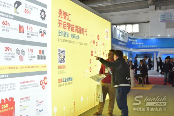 来宾在展板前详细了解行业首款十年质保合成风机齿轮油可耐压S5 Wind