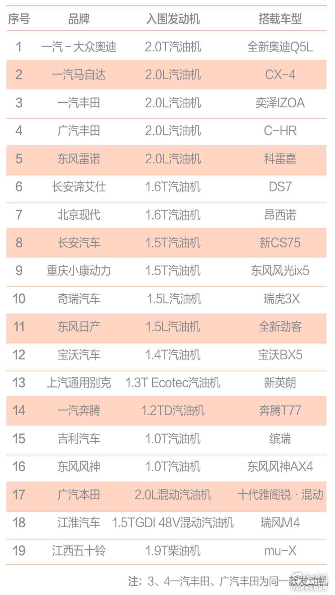 入围今年实车测试的机型中,排量全部集中在1.0L-2.0L范围内,其中1.5L(包含)排量以下的机型共有十款,1.5L排量以上的机型共有八款;混合动力机型两款,柴油发动机一款。今年入围的小排量机型数量增幅明显,其中还包括三款小排量三缸涡轮增压发动机,可以看出主机厂在小排量机型方面的研发投入愈发明显,这点也与中国目前的节能减排政策相吻合。混合动力发动机方面,江淮汽车与广汽本田有着不同的技术路线和解决方案,在测试中将会有直接的较量。今年新增加的一款柴油发动机可以说是本次入围实车测试所有机型中最特殊的一款,入围名单中已经连续多年未出现过柴油机型,这次江西五十铃的这款柴油发动机是否可以从所有机型中突围?在这里需要画一个问号。