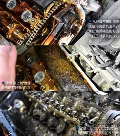 上面这张图片,对比了使用假机油和使用纯正机油的内部情况,干净程度一目了然。如果你的车带有气门调节系统,必定会受到假机油的影响。