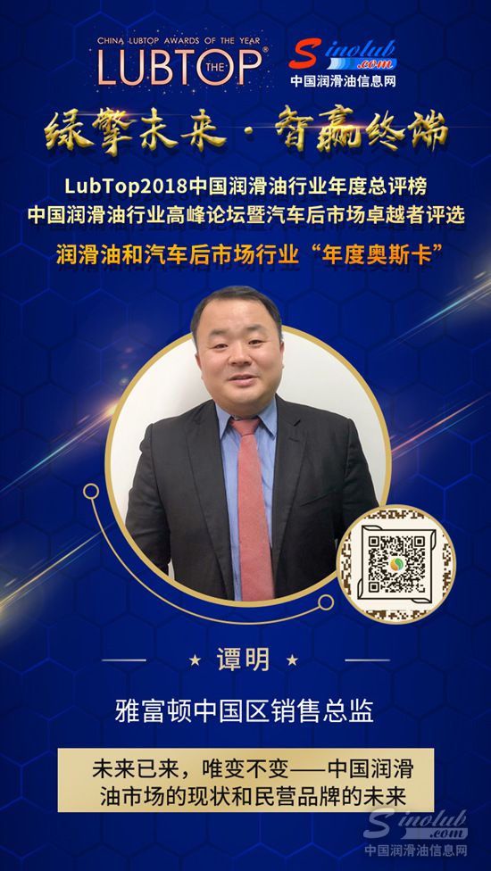 LubTop2018论坛精彩纷呈,今天又将揭晓另一位LubTop2018中国润滑油行业高峰论坛演讲嘉宾——雅富顿中国区销售总监谭明先生。
