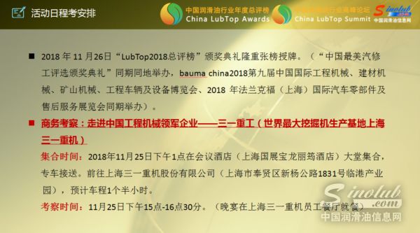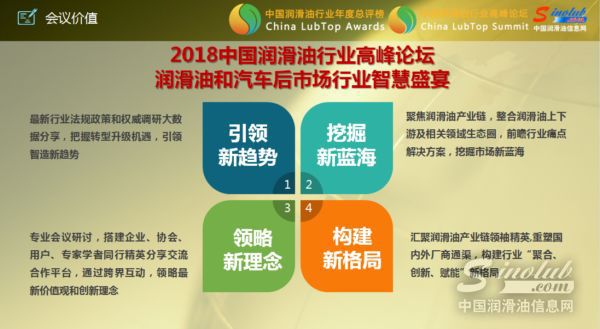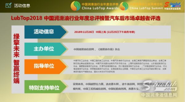 由中国润滑油信息网(www.sinolub.com)、 《润滑油市场》杂志发起主办的LubTop2018中国润滑油行业高峰论坛将于2018年11月26日在上海隆重举行,本届论坛的主题是“绿擎未来智赢终端”。LubTop2018论坛旨在倡导润滑油和汽车后市场品牌关注低碳、节能、环保和循环发展生产体系的建立与完善,加快构建生态文明体系,以绿色发展托举起产业升级的重任,引领行业高质量发展的未来;通过创新驱动,跨界融合,赋能终端,实现产业链共赢。