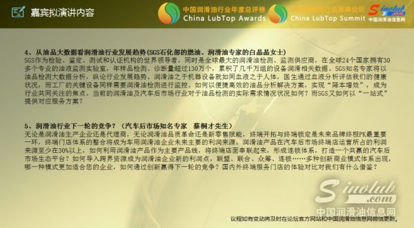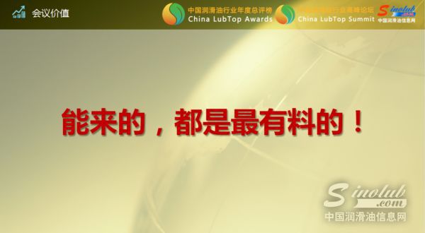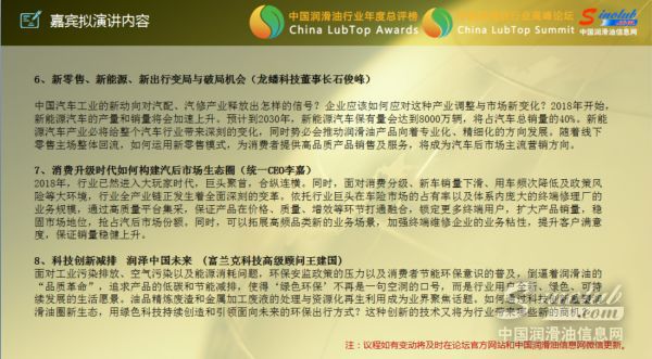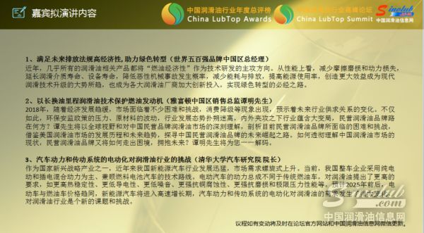 行业重磅大咖作为主讲嘉宾奉献精彩演讲,将携全球视野、终端资源、产业创新、跨界智慧进行思维大碰撞。探索润滑油产业如何站在新的历史方位,把握新机遇,开启新征程,从不同角度深入剖析法规与最新行业趋势分析,分享新型动力及最前沿的技术成果,探讨润滑油创新商业模式,就即将到来的2019年的油品升级、排放控制先进技术、新能源汽车、终端模式、消费升级等将如何影响润滑油行业发展格局的演变进行智慧分享。它将引领业界人士对中国润滑油产业作更多、更深入的思辨,积极推进润滑油行业和汽车后市场的健康发展。