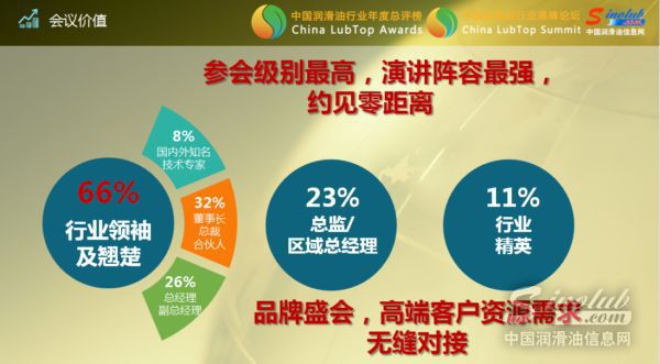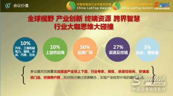 LubTop2018论坛是中国进入新时代的重磅润滑油行业盛会,是参会级别高、嘉宾阵容强、实现跨界融合互动的行业创富论坛,是一场对中国润滑油和汽车后市场行业未来发展产生重要影响的智慧盛宴。参加盛会的包括润滑油行业品牌标杆,“润滑油和汽车后市场行业奥斯卡”LubTop2018总评榜全部获奖品牌的领导,包括美孚、壳牌、嘉实多等全球知名润滑油品牌的高管,润滑油行业全部上市公司以及各个知名品牌的董事长、总经理。可以说,出席LubTop论坛的嘉宾是润滑油行业最有料的,这些人控制了中国润滑油行业95%以上的市场份额。参加会议的还有来自汽车、工程机械领域及其后服务市场的行业领袖、专家泰斗、各省润滑油协会会长等多位中外润滑油产业链嘉宾,嘉宾大咖将齐聚上海,共襄盛举。