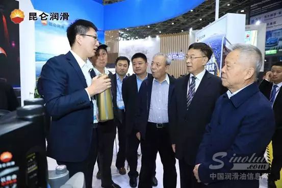 国务院国资委大型企业监事会原主席贾成炳(右一)、中国欧洲经济技术合作协会会长徐秉金(右三)、中国机械国际合作股份有限公司董事长张福生(右二)莅临参观昆仑润滑展台