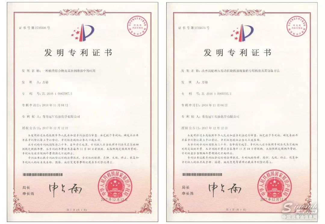 冠军®自主研发的“聚能酯合成润滑技术”和“涡轮增压发动机高温润滑保护技术”获得国家发明专利。