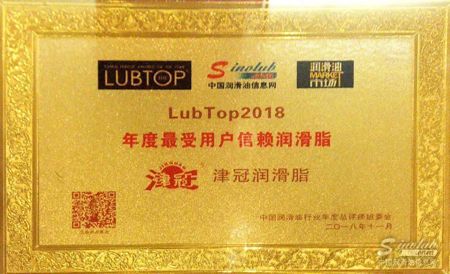 津冠润滑脂摘取“LubTop2018年度最受用户信赖润滑脂”桂冠