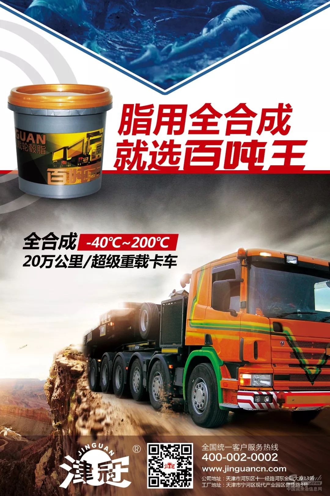 2017年,津冠润滑脂采用超凡进口添加剂,通过添加纳米氧化物的超强抗磨因子以及优化的添加剂配方,研制出了换脂周期长达20万公里的全合成基础油的轮毂润滑脂——百吨王超级重载轮毂脂。津冠新工厂落成后,随即引进先进的检测和生产设备等全套设施,百吨王为先进设备的受益产品。本品采取非传统方式进行研磨,而使用先进的均化设备以完成研磨工艺,皂基结构不被破坏,使基础油更稳定长效的发挥作用,相比普通矿物油润滑脂产品平均节约燃料4.3%。