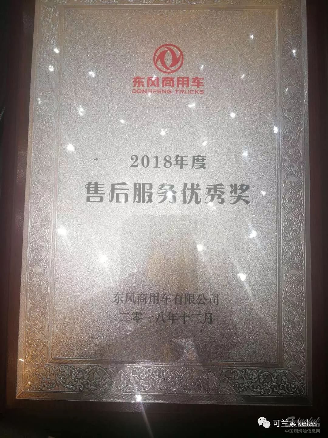 可兰素荣获东风商用车2018年度售后服务优秀供应商奖