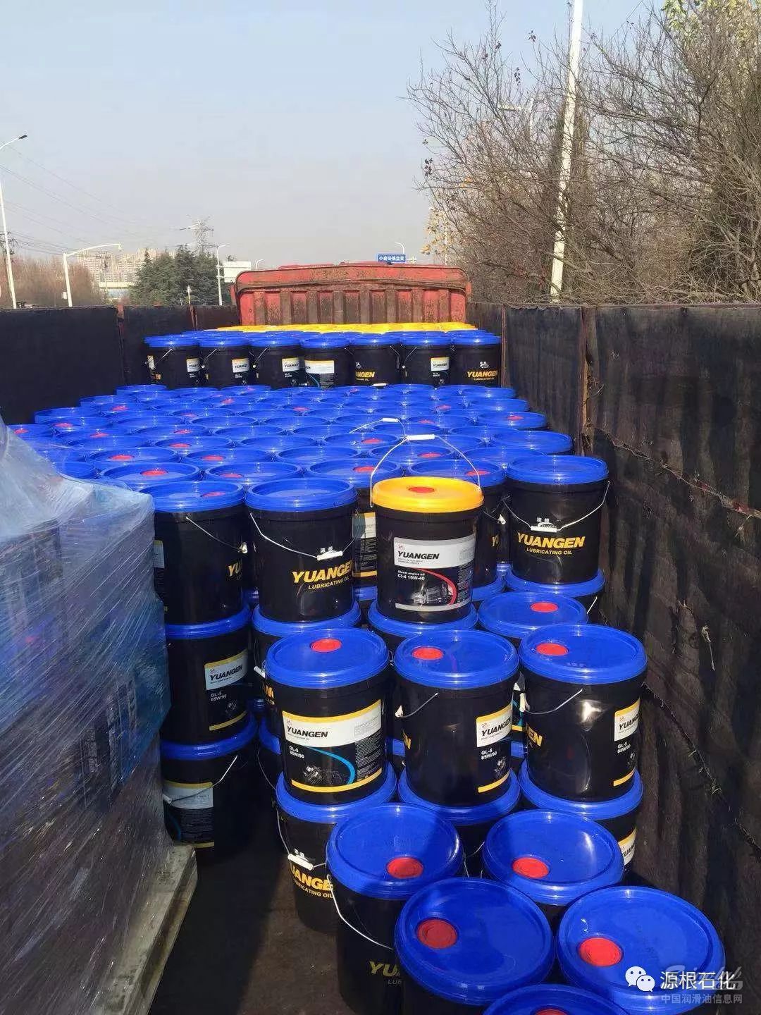 12月15日,在源根石化公司厂区里,工人们正在给几辆重型卡车装载润滑油产品,货物将通过国际公铁联运运至哈萨克斯坦。