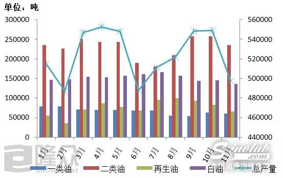 隆众数据显示,截止2018年11月,全国总产量在577.5万吨左右。其中一类油产量73.2万吨,二类油产量253.6万吨,白油产量167.8万吨,再生油产量82.8万吨。从全国的产能统计来看,2018年的基础油整体产能在1100万吨左右,市场开工率大概在57%左右。