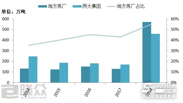 由上图看出,从2014年开始全国基础油产能总体呈现缓慢增长的态势,两大集团基础油产能占比逐年降低,地方炼厂发展较为迅速。进入2018年,因地方炼厂新增产能较多,目前已有装置产能已超越两大集团产能,未来仍有增长趋势。
