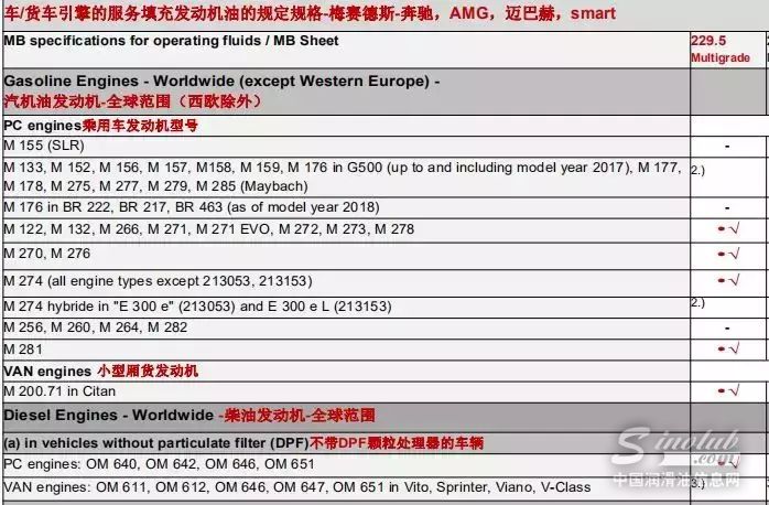 奔驰229.5标准油品适用范围广泛,可以适用发动机型号如下表所示: