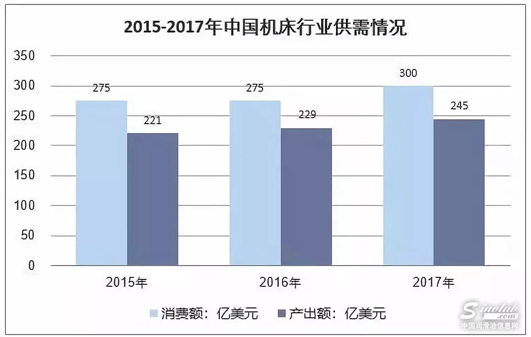根据中国机床工具工业协会统计,2015年至2017年,我国机床市场消费总额分别为275亿美元、275亿美元、300亿美元,我国机床产出总额分别为221亿美元、229亿美元、245亿美元。经历了2016年机床市场企稳后,2017年国内机床行业受下游市场智能制造需求逐步向好。