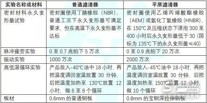 以下是普通滤清器产品与平原滤清器长寿命产品性能对比一览表——