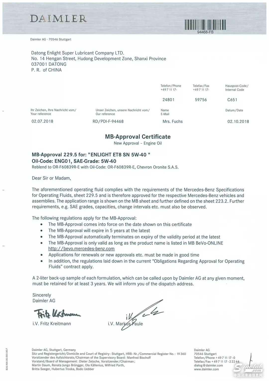 近日,英莱壳汽机油获得了梅赛德斯奔驰MB 229.5的技术认证,认证号是94468-FB。这是继奔驰MB 229.3认证后,英莱壳又一次收获奔驰认证。这标志着英莱壳润滑油产品的专业性以及性能再次得到了奔驰公司的认可。