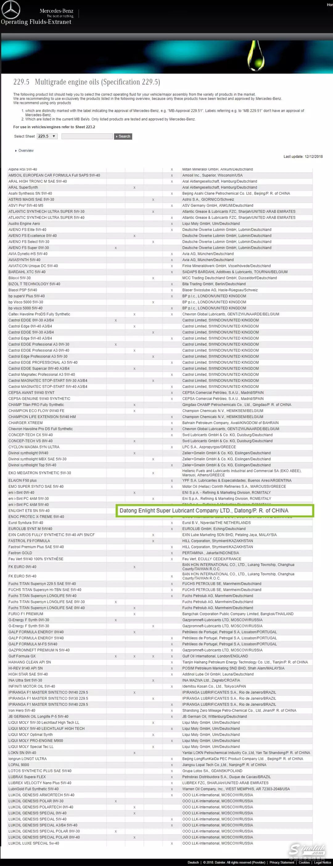 下图为MB 229.5认证机油名录部分截图,框选为英莱壳润滑油,该名录公布于奔驰官网