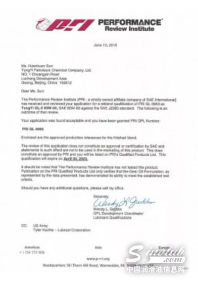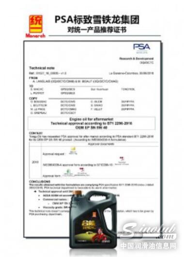 统一润滑油旗下合能8系全合成润滑油,获得PSA标致雪铁龙集团对统一产品推荐证书。