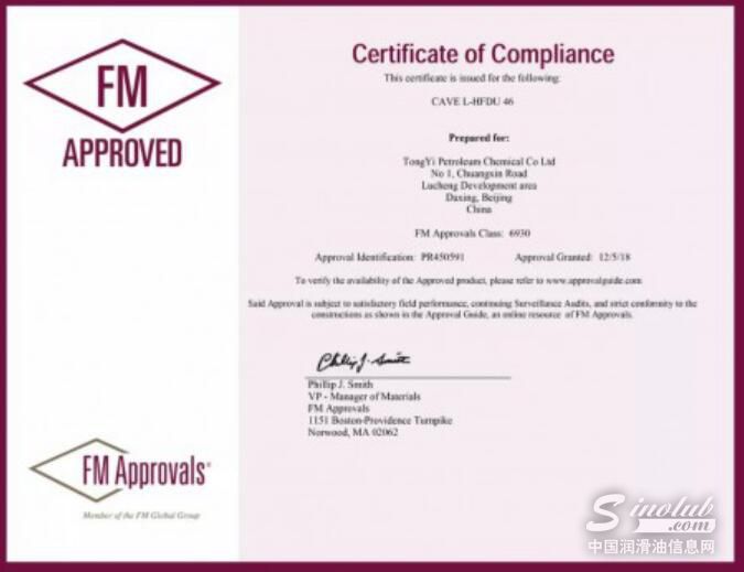 统一加威合成酯型难燃液压油喜获美国FM机构火险认证,并成为FM中国区唯一获得此认证的中国品牌与产品。