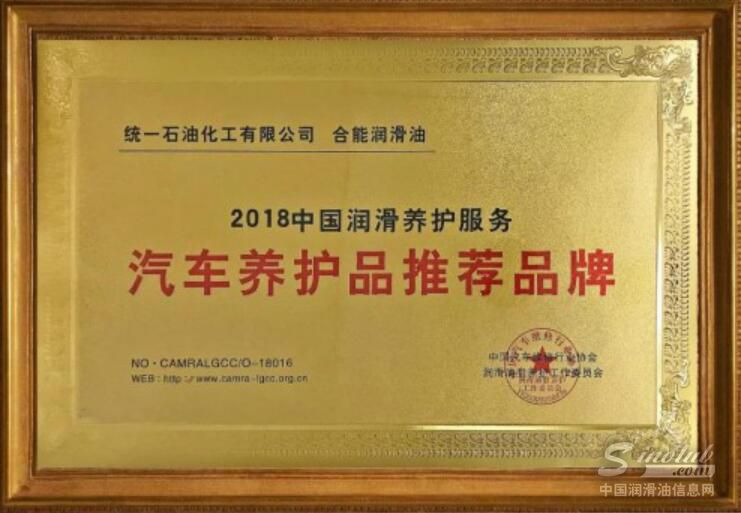 统一石化旗下合能品牌,获得2018年中国润滑油养护服务汽车养护品推荐品牌。