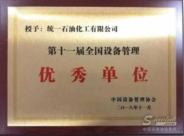 统一石化荣获第十一届全国设备管理单位优秀称号。