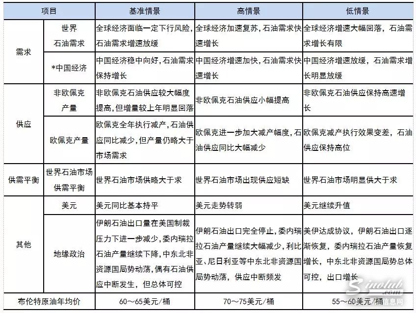 低情景:如果中美经贸摩擦等再度升级导致全球经济复苏受阻、“减产联盟”减产执行情况变差、美国原油产量强势增长,则全年油价将面临较大的下行压力,均价水平或降至55~60美元/桶以下。