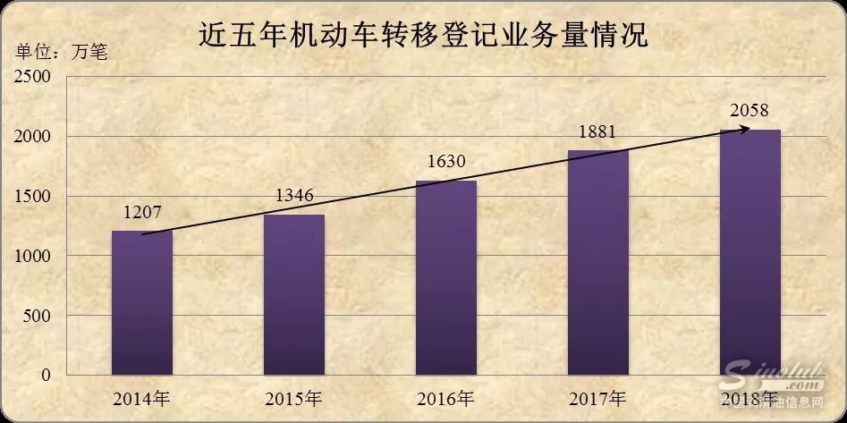 汽车转移登记业务量持续增长,二手车交易市场日益活跃。2018年,全国共办理机动车转移登记2128万笔,其中汽车转移登记2058万笔,占96.72%,比2017年增加177万笔,增长9.44%。从统计情况看,近五年汽车转移登记与注册登记业务量的比例由0.55上升至0.77,反映出二手车交易市场日益活跃。