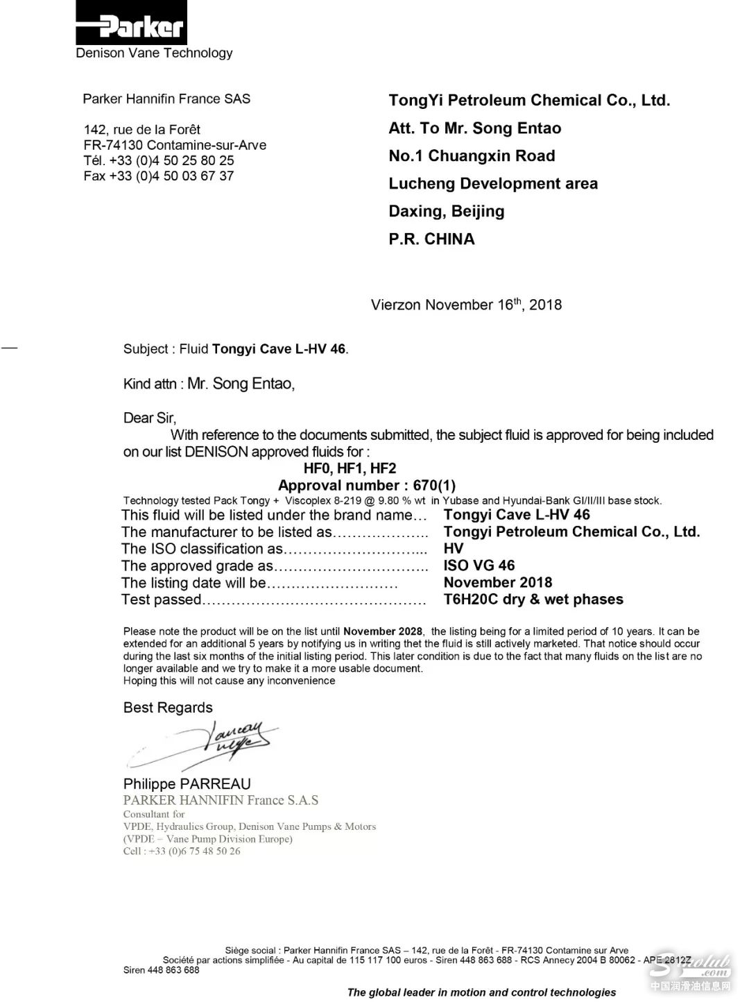 统一加威高级抗磨液压油获得丹尼逊认证证书