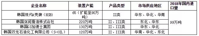 首先排名第一位的是韩国,韩国是亚洲最大的基础油生产国,也是中国最大的进口国。主要品牌包括GS、现代、双龙、sk四大品牌为主。产品也以二类三类基础油为主。其中GS、SK、双龙都有三类油供应。