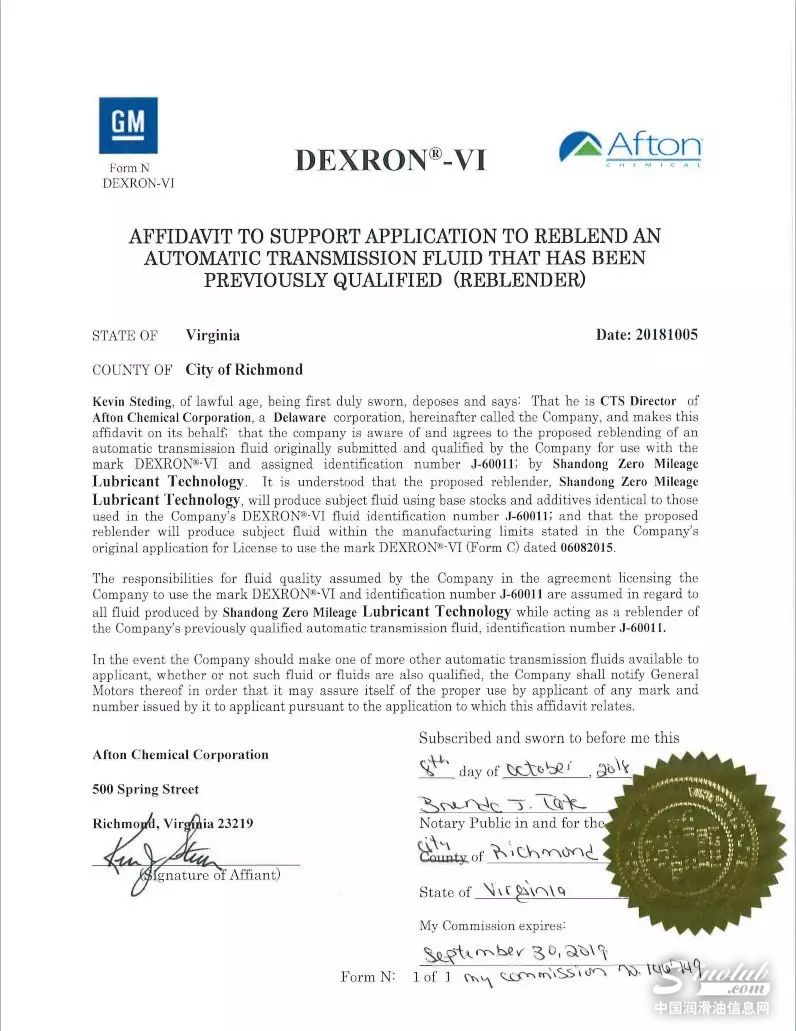 零公里变速箱油通过DEXRON-VI变速箱油品调和认证!